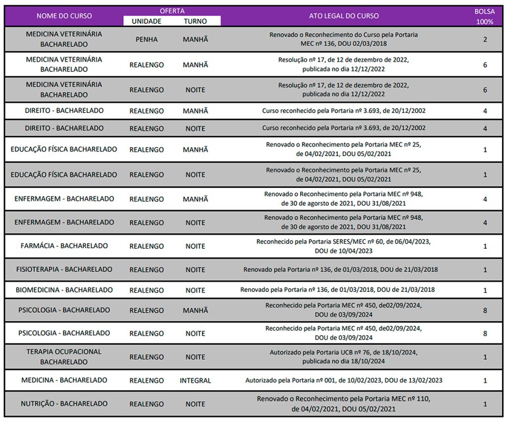 Dentre os cursos de graduação UCB, foram ofertadas 54 bolsas integrais, de acordo com a distribuição a seguir: