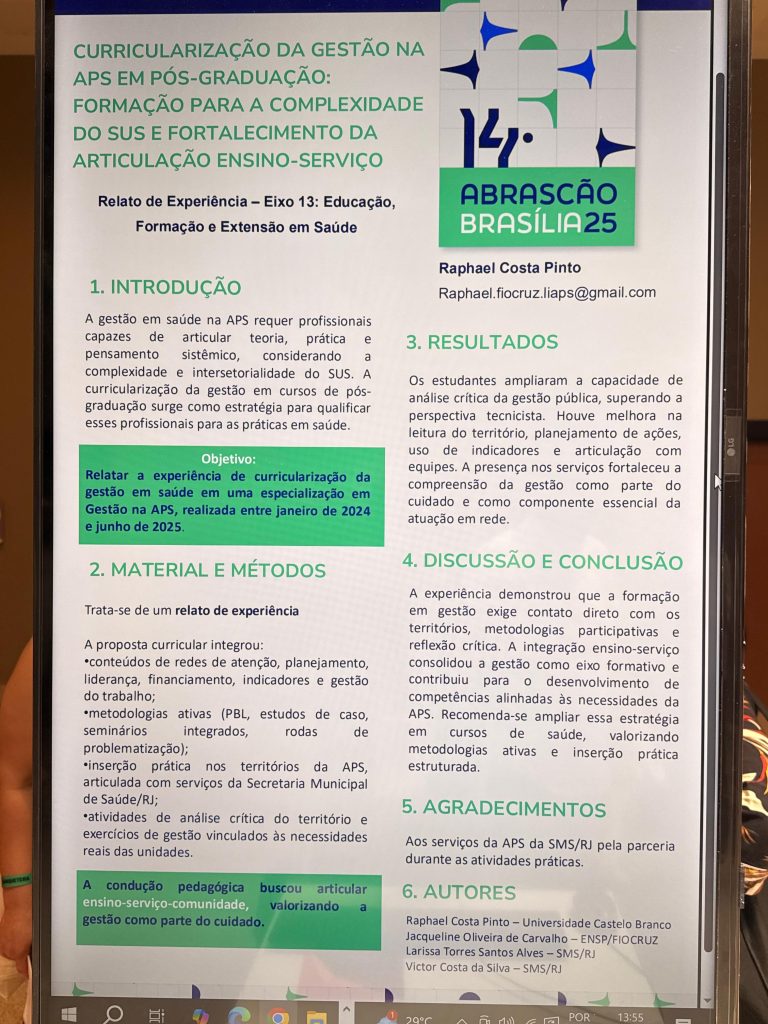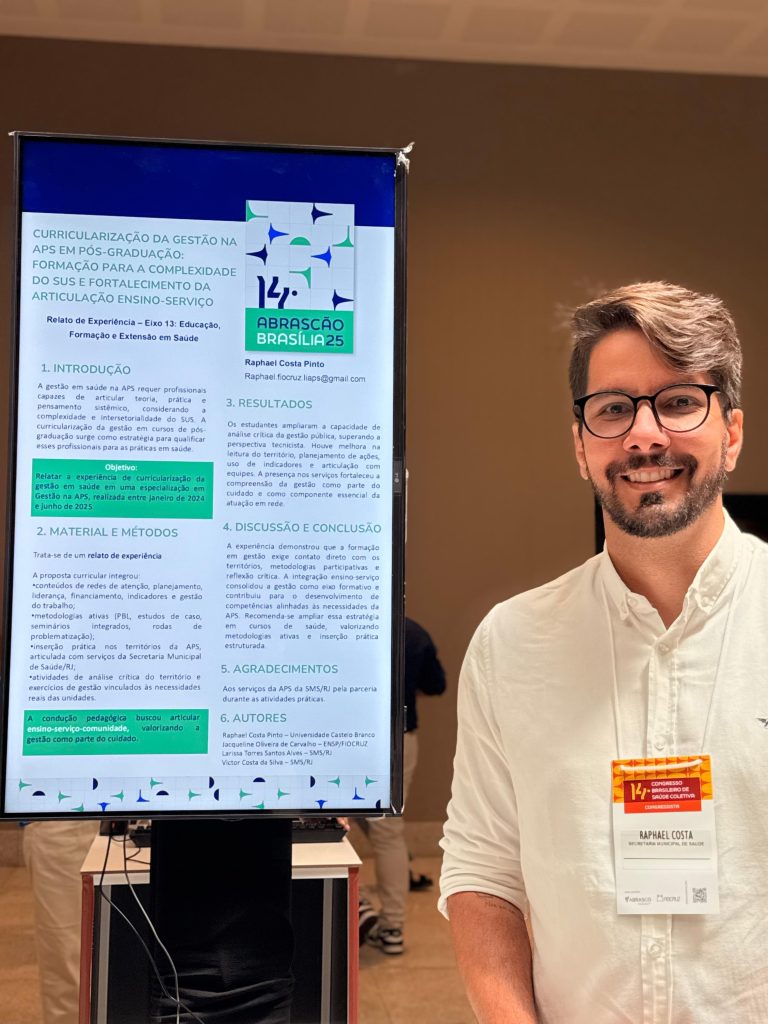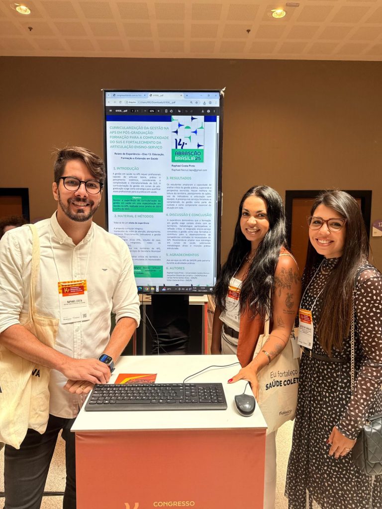 Dada a relevância do evento, o professor da Universidade Castelo Branco, Raphael Costa, representando a Pós-Graduação em Gestão em Saúde na Atenção Primária, acompanhado das professoras Jacqueline Carvalho e Larissa Torres, apresentou o trabalho “Curricularização da Gestão na APS em Pós-Graduação: Formação para a Complexidade do SUS e o Fortalecimento da Articulação Ensino-Serviço”.