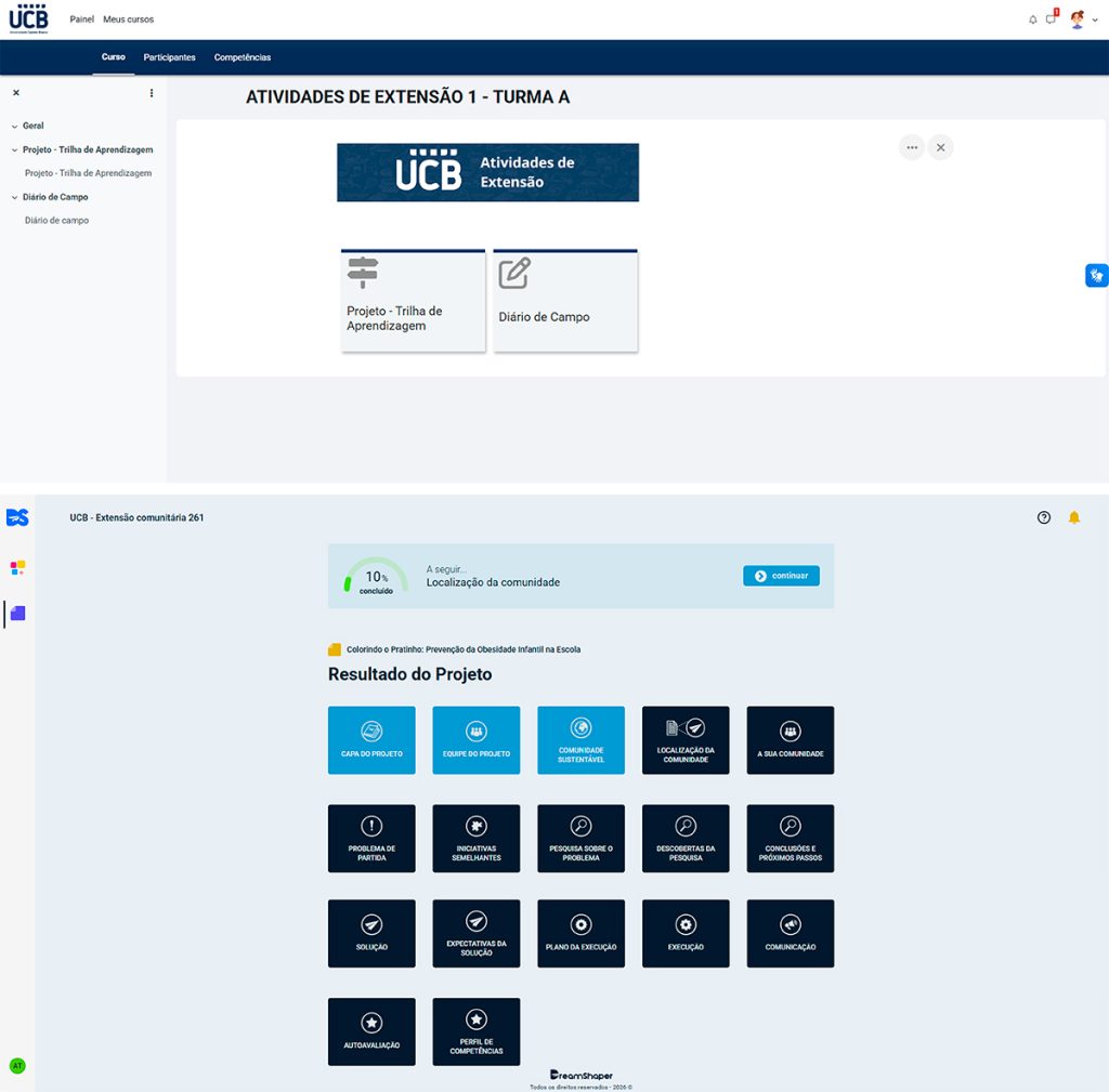 A ferramenta DreamShaper já foi testada e está em uso nas atividades das disciplinas de extensão universitária da UCB no semestre 2026.1. Com ela, os estudantes conseguem inserir informações coletadas durante as atividades, com geolocalização e divisão por etapas. Dessa forma, os grupos desenvolvem seus projetos, elaboram as estratégias de execução e, após registrar as ações realizadas, avançam para as próximas fases, permitindo a conexão entre teoria e prática em uma experiência de aprendizagem ativa.